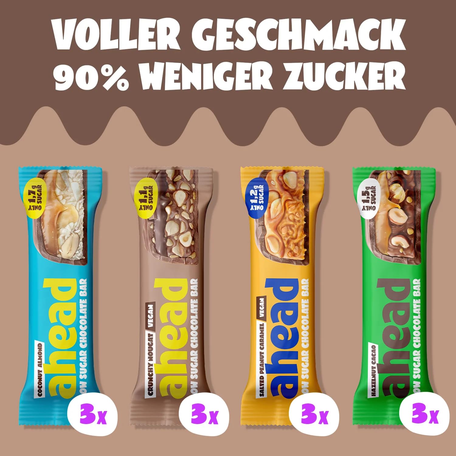 - Irresistibly delicious: Not another protein bar that is a low carb sweets without sugar but also tastes like that. Delicious white chocolate chunks or cacao nibs, coconut flakes and low carb chocolate – the Ahead bars combine functionality and taste.